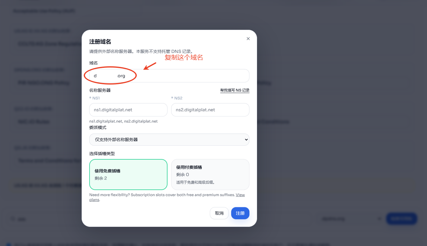 先在 DigitalPlat 点击注册,申请一个域名,然后复制域名去添加到Cloudflare