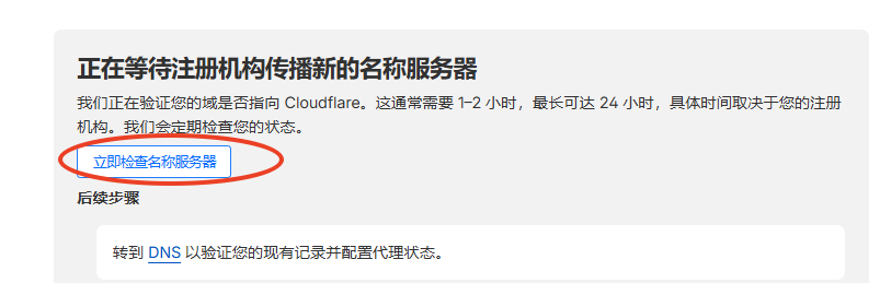 Cloudflare点击立即检查名称服务器,确认后等待 DNS 生效,通常需要 1–2 小时。