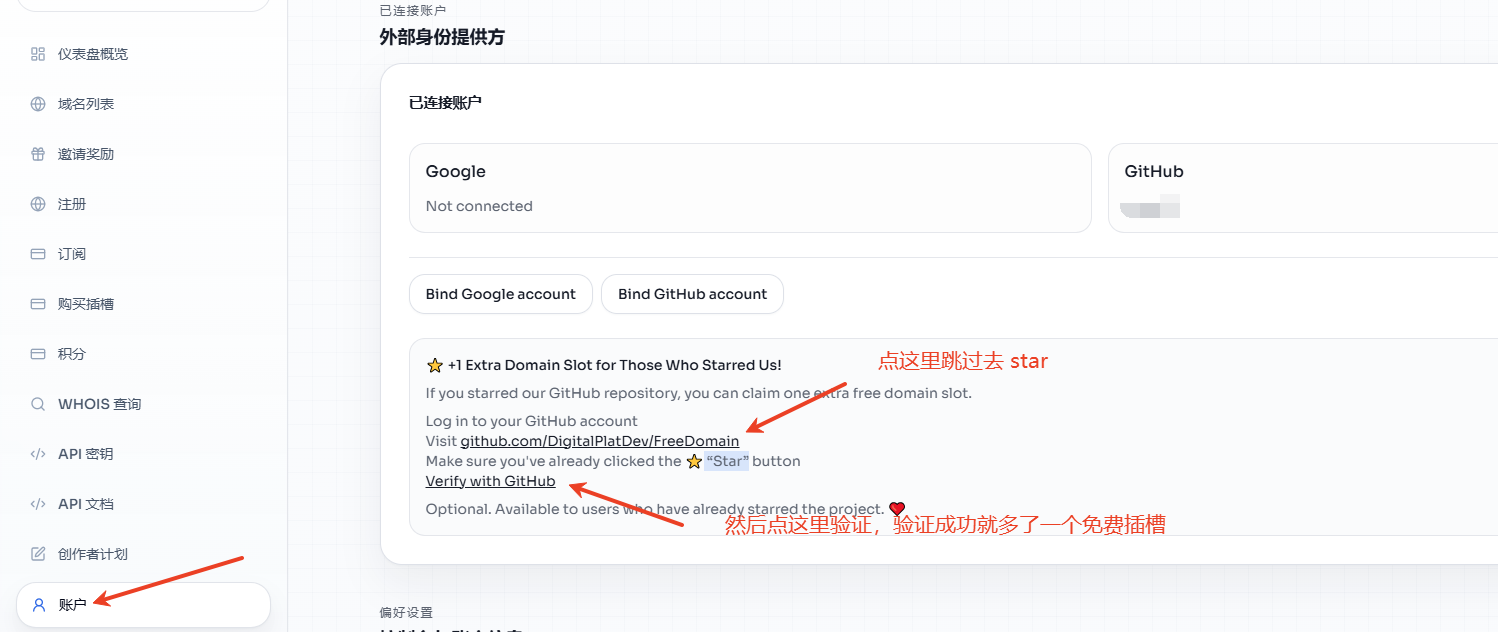 注册流程暂省略(绑定GitHub账号之后 “Star”他们的项目可以额外获得一个免费的域名)