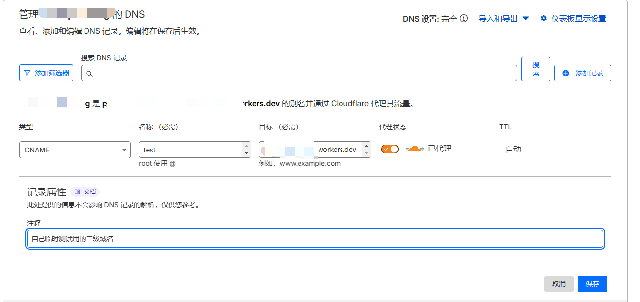 类型:CNAME 名称:二级域名名称,将会拼接在你的域名前面 目标:你的Worker的完整域名,在Worker的【设置-域和路由】里可以看到,例如 p12345.abc.workers.dev