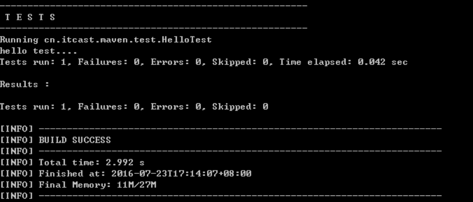 cmd 执行 mvn test 执行 src/test/java 下单元测试类,下图为测试结果,运行 1 个测试用例,全部成功。